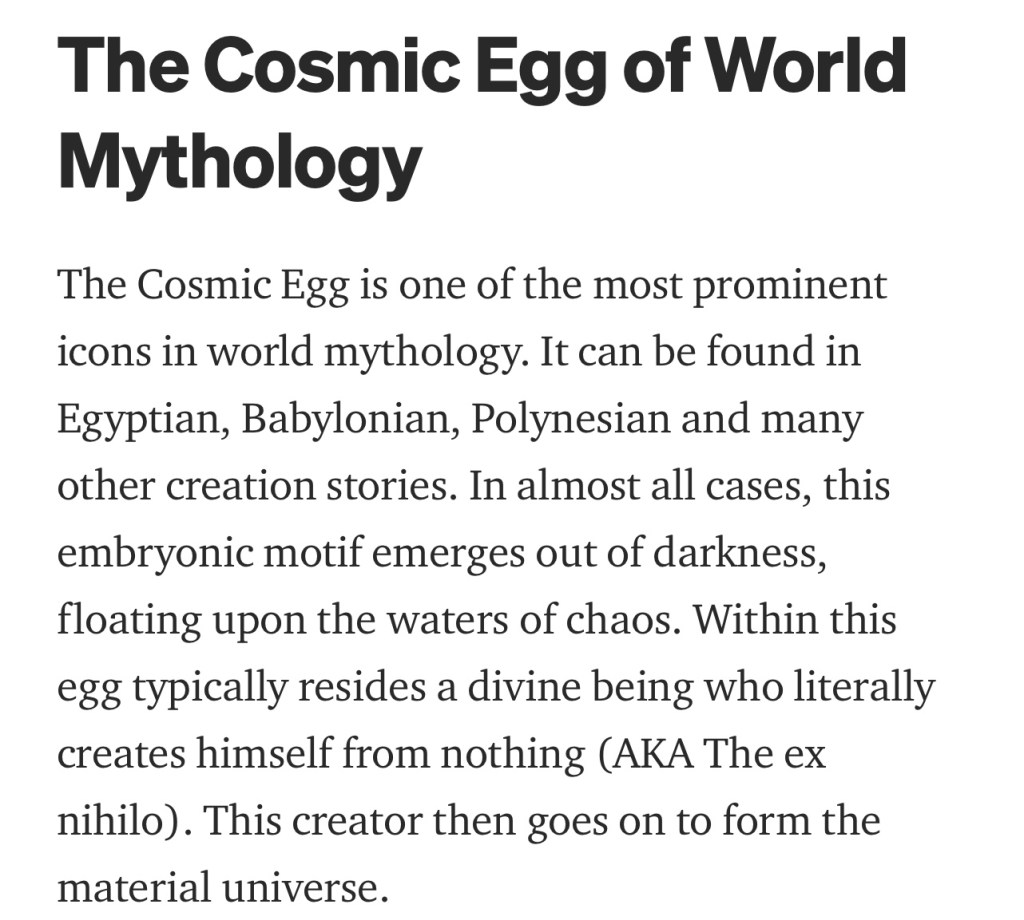 Eggs have always been a symbol of life, creation, fertility, and resurrection. We see this theme frequently depicted throughout all mythologies in the form of the Cosmic Egg.