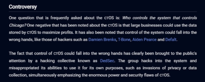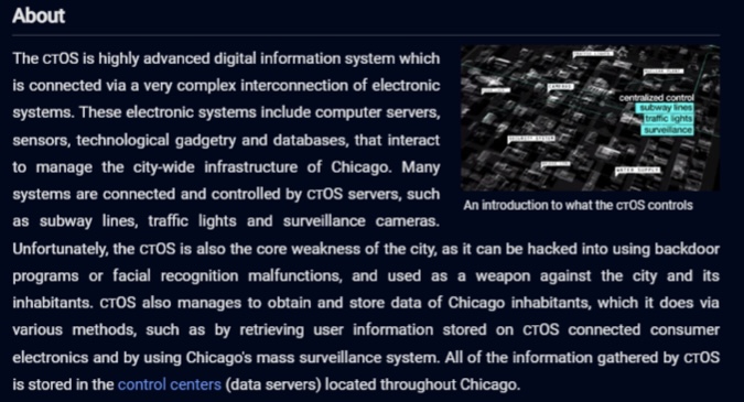 The CTOS controls everything from cellphones and bank accounts, to infrastructure and security systems. Throughout the game this system is used for a number of nefarious purposes, and it is shown that people with knowledge of the system can manipulate it to cause massive collateral damage.