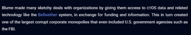 Blume creates the CTOS blockchain system and eventually works hand in hand with the government and major corporations to socially engineer society towards it’s desired goals through Big Brother tech.