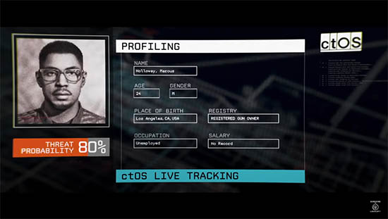 In the game the government and corporations use the data they collect to discriminate against citizens through crime prediction software. Basically, the CTOS assesses a crime or potential crime and then searches its database for citizens who may have the skills to commit the offense. The first mission of Watchdogs 2 involves the protagonist erasing his CTOS profile because he is being investigated for a crime he didn’t commit, simply because the CTOS system flagged him as a high probability suspect.