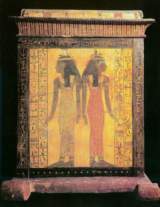 Nephthys and Isis look very similar and can only be differentiated by their headdresses.